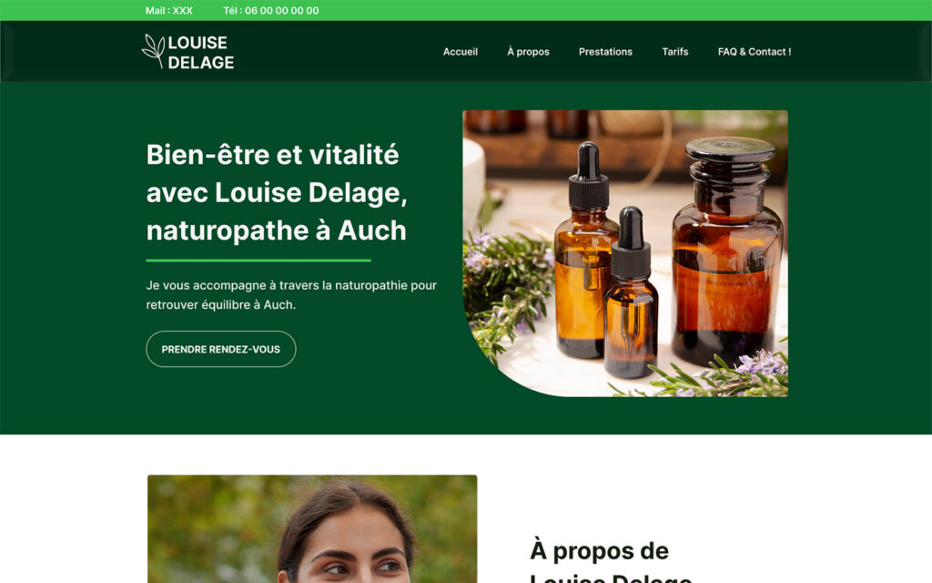 Dans le cadre d’un projet fictif, j’ai réalisé la conception d’une maquette web “one-page” pour une praticienne en naturopathie, Louise Delage, basée à Auch.